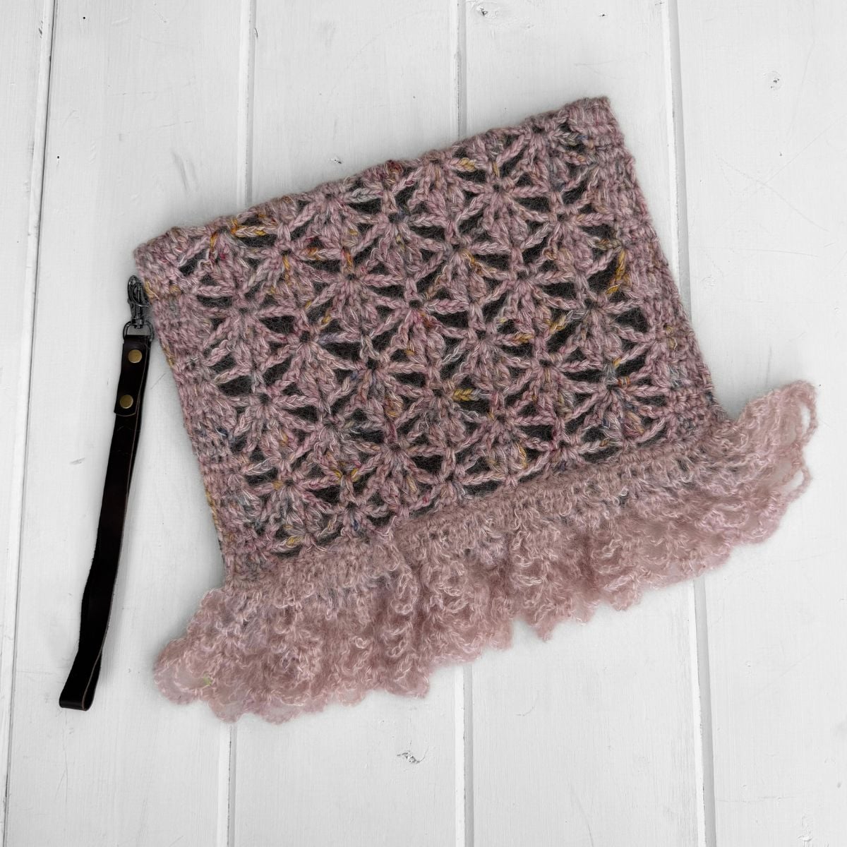 An open lace crochet fabric creates a light, airy texture, accented with a softly ruffled edge for movement and visual interest. A lightweight genuine leather strap and lining add subtle structure without heaviness, allowing the bag to feel comfortable and easy to carry while still offering durability and refinement. Designed to feel artistic, this piece stands out as a statement accessory.