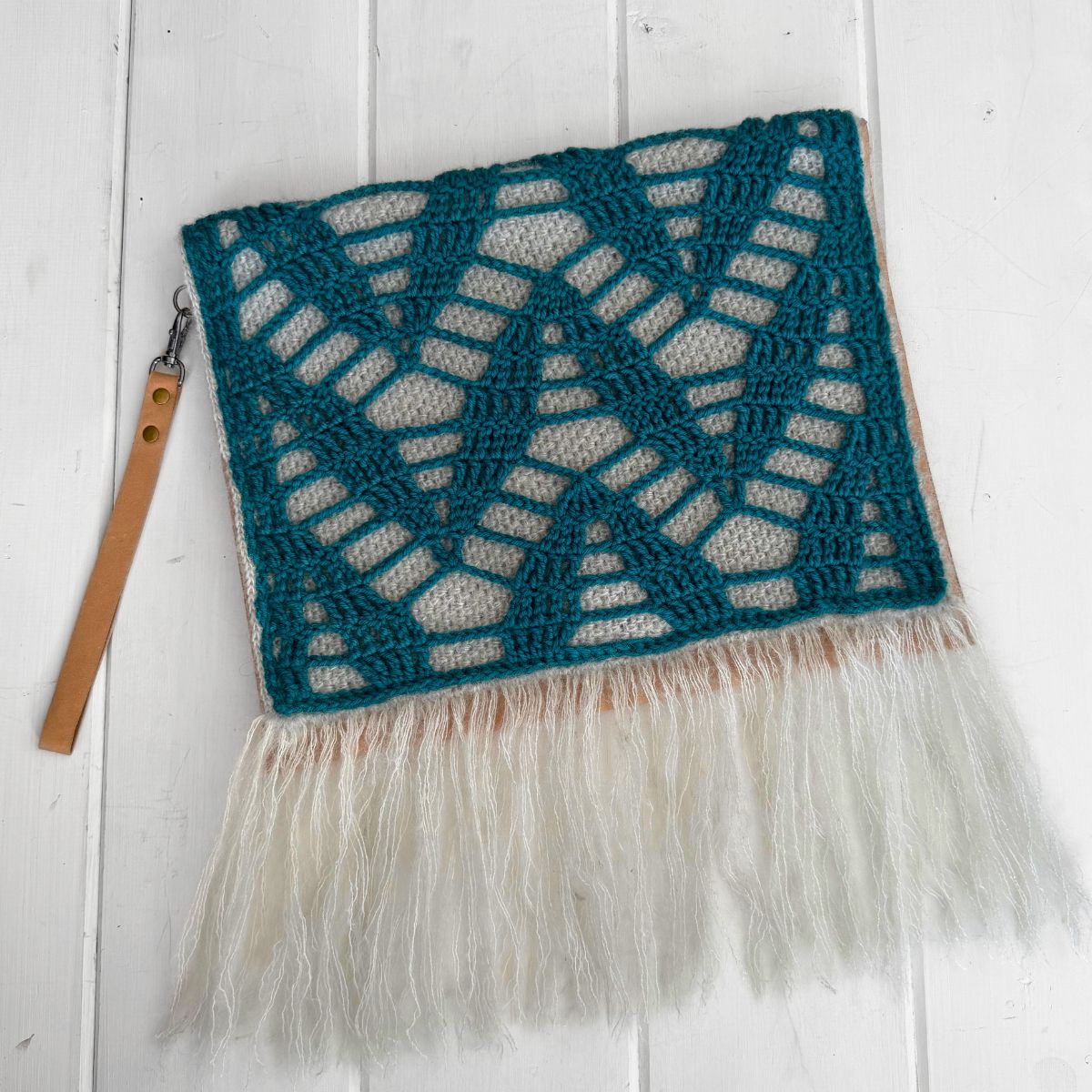 The structured crochet body creates a bold geometric design, while the fringe detail adds a soft, tactile finish. A leather wrist strap provides durability and ease of use, making this piece both functional and expressive.